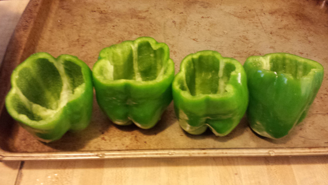 While the meat and veggie mixture is cooking, take 4 medium to large green peppers (or red or yellow peppers if you prefer). Cut off the tops, remove the seeds and white membrane.