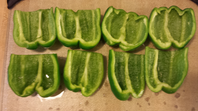 4. Take the peppers and cut off the tops, remove seeds, and cut in halves lengthwise.