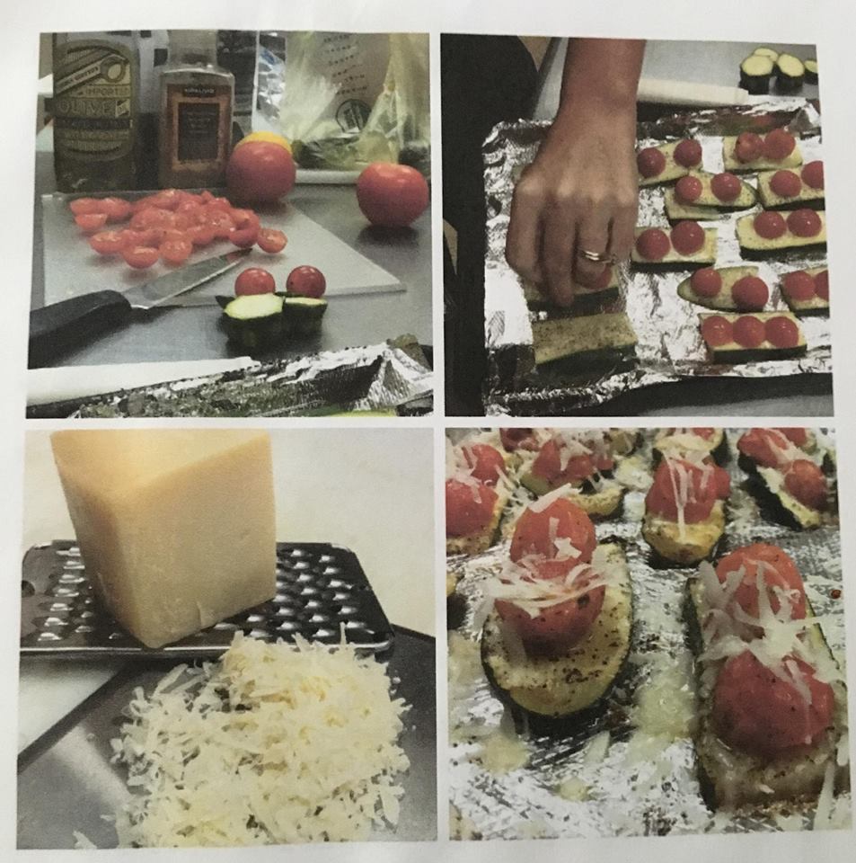 - Arrange zucchini slices on the baking sheet and drizzle with olive oil (could maybe try melted butter instead?). Place tomatoes along the zucchini slices. Sprinkle with salt & pepper. Sprinkle Parmesan or mozzarella cheese on top.