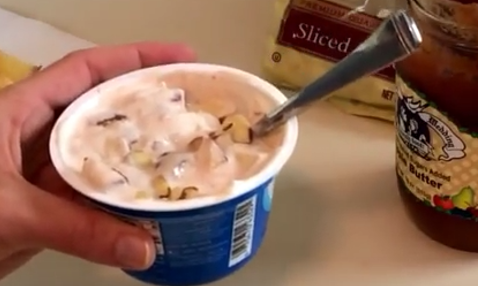 - In the yogurt contain or a bowl, stir in the apple butter. Add in the chopped apples and slivered almonds or nuts/seeds of choice.